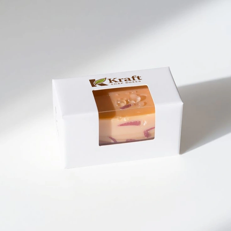 White Soap Boxes: Personalized white soap boxes with a window used for minimalist and clean branding solutions.