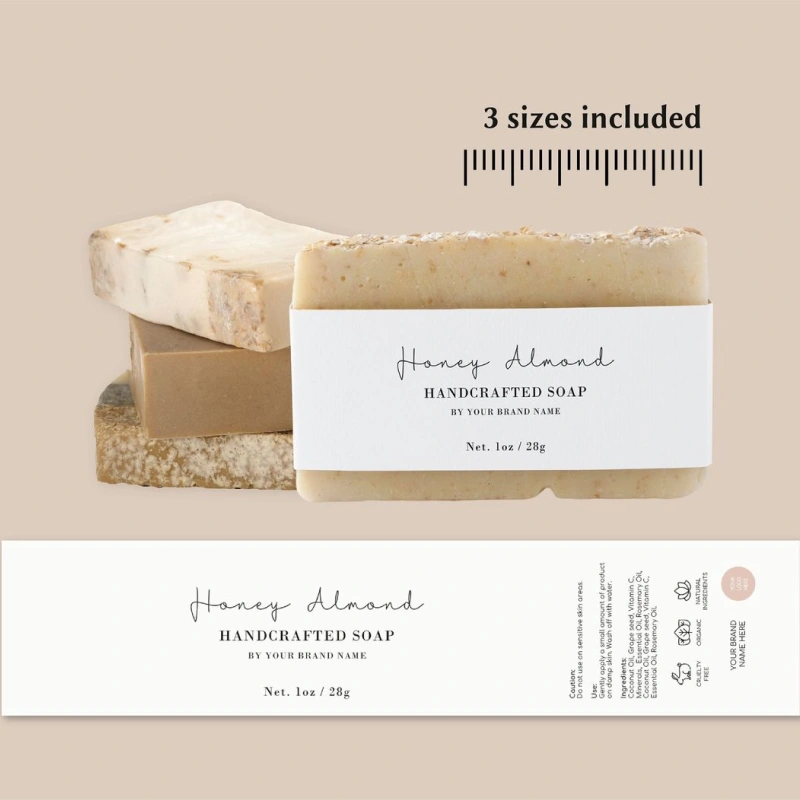 The soap label can be customized with product details and branding elements. You can: